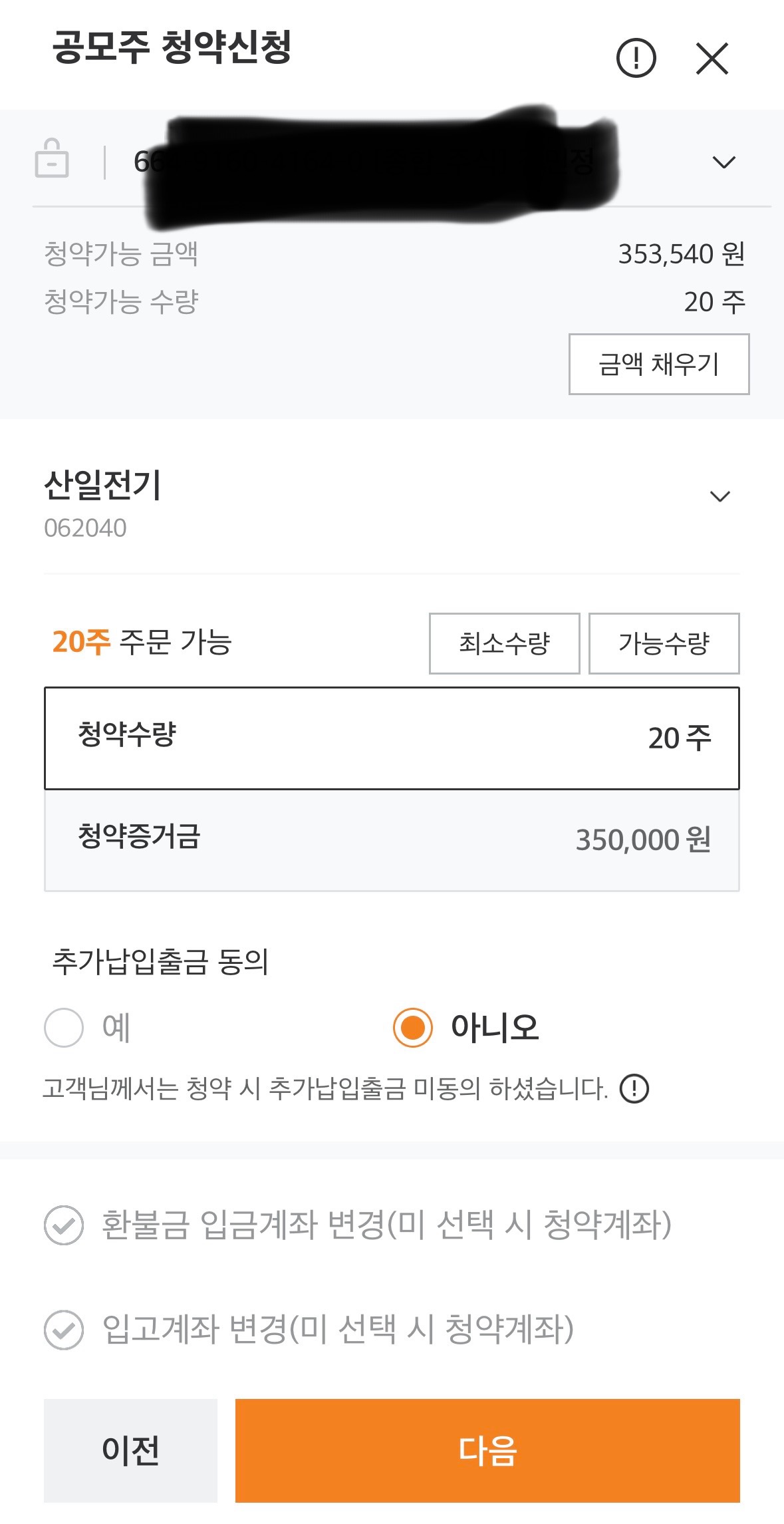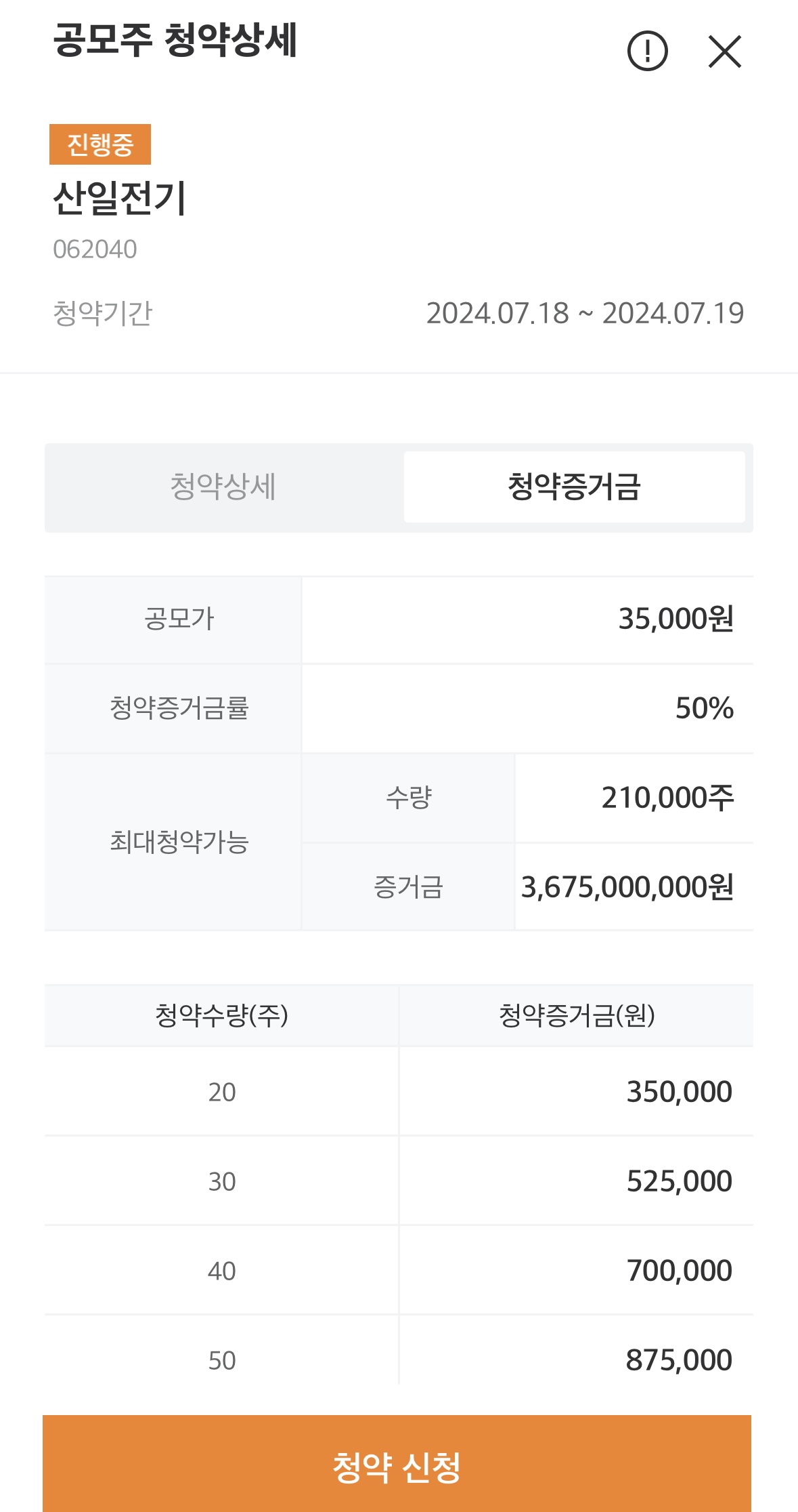 산일전기 청약 시 최소 수량 20주 입니다.