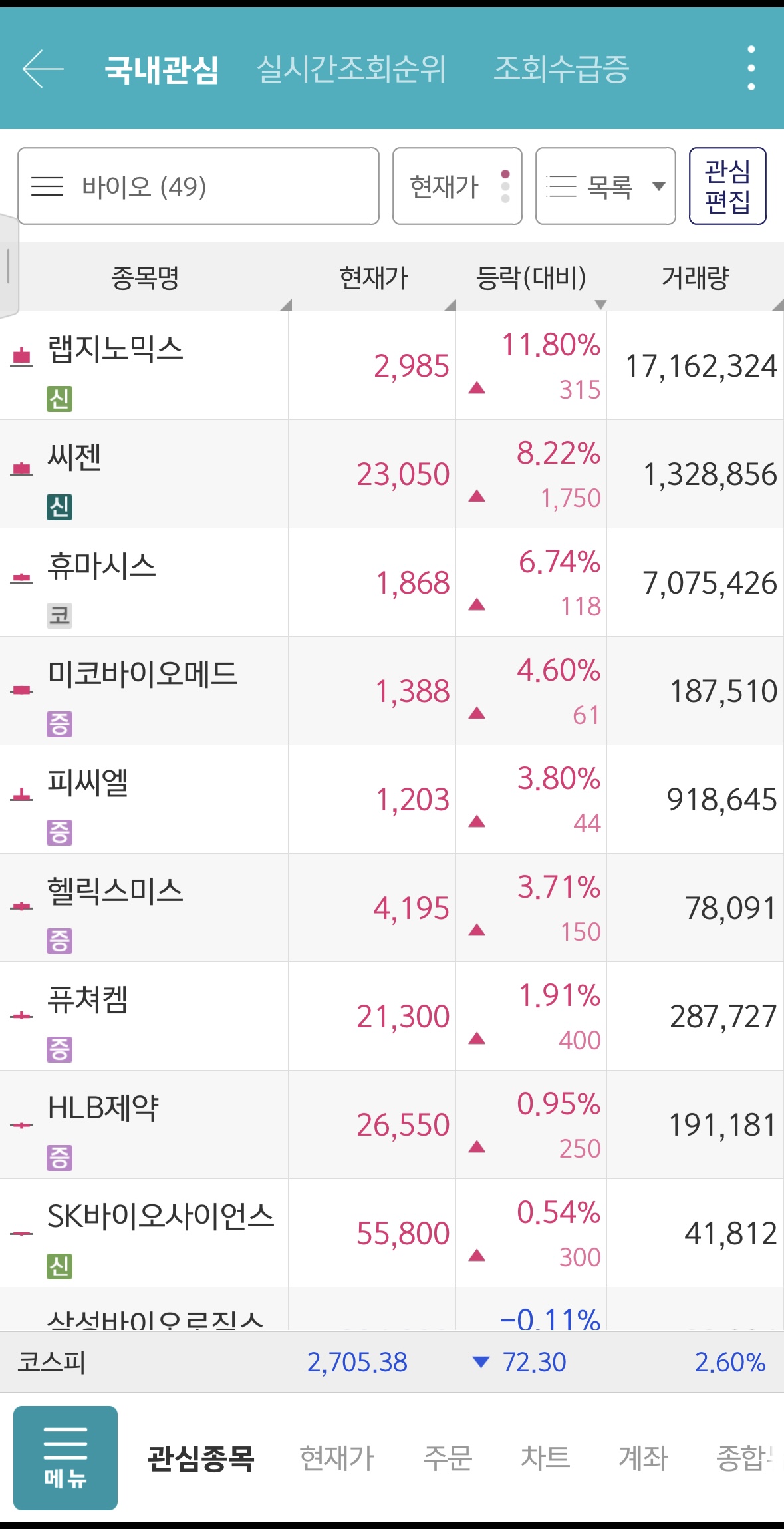 바이오주 중 키트주 들이 오르고 있다.